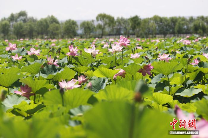 盛夏时节,宁夏银川市鸣翠湖国家湿地公园的荷花竞相开放,为湿地增添美丽景观,吸引游客前来打卡拍照。图为7月20日在宁夏银川市鸣翠湖国家湿地公园拍摄的荷花。中新社记者 于晶 摄