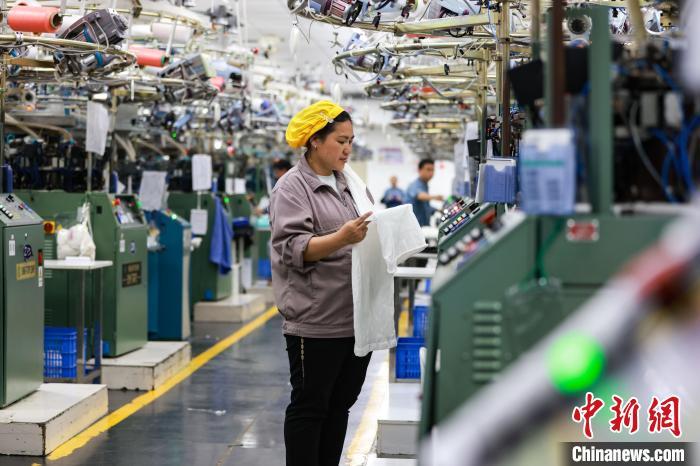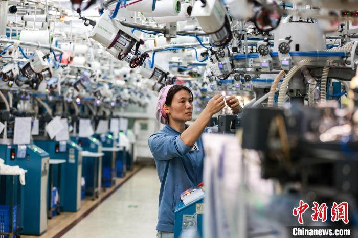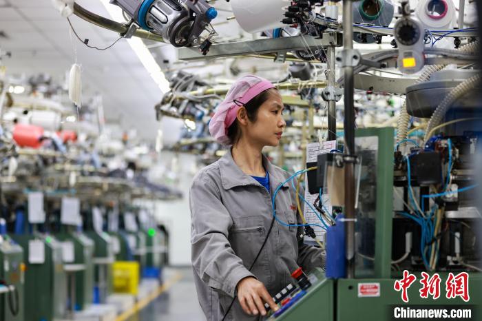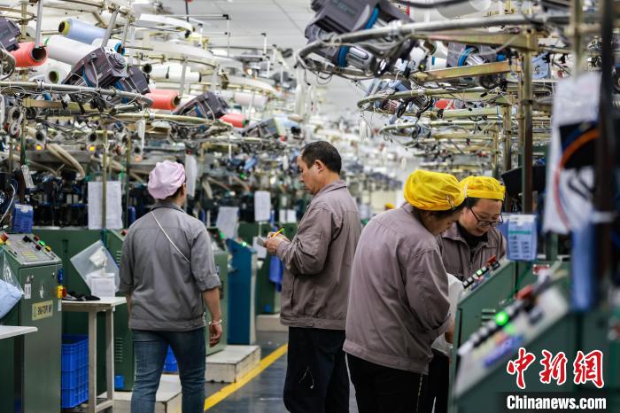 图为工人在赶制无缝针织服装订单产品。龙兴伟 摄