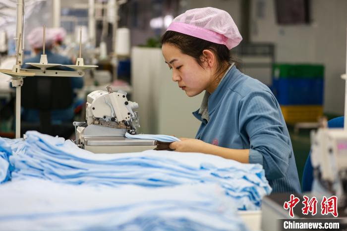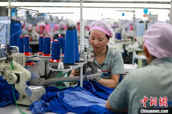 图为工人在生产线上赶制服装订单。龙兴伟 摄