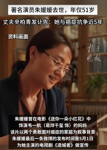 韦一航妈妈真的去平行时空了。21日,演员@辛柏青 发布妻子@朱媛媛 去世讣告,称朱媛媛于2025年5月17日去世。辛柏青透露,朱媛媛与癌症抗争了近五年。朱媛媛曾在2020年12月31日上映的电影《送你一朵小红花》中饰演韦一航(易烊千玺 饰)的妈妈,该片以两个勇敢面对癌症的家庭为叙事背景。因为片中韦一航患有脑瘤,有网友看到朱媛媛去世的消息表示,“原来妈妈和韦一航都在抗癌,平行世界里的他们应该是幸福健康的”。@电影送你一朵小红花 官微发文悼念朱媛媛:“媛媛老师,感谢您为我们留下精彩动人的演出。路走好,永远想念您。愿天堂满是小红花。”