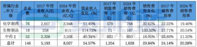 具体来看,根据146家(化学制药计76家、生物制品计18家和中药II计52家)2017年与2024年8年间营收和销售费用对比(变化详单详见文末列表),销售费用率总体下降近4个百分点。