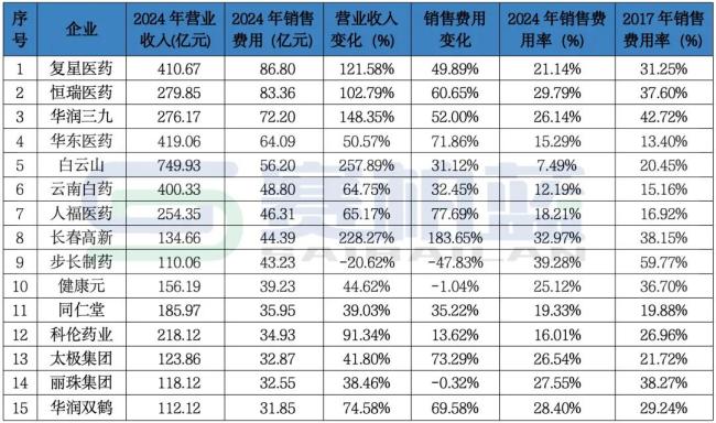 2017年至2024年,多种挤压药品价格水分的政策实施对销售费用超过30亿元的企业也产生了深远影响。