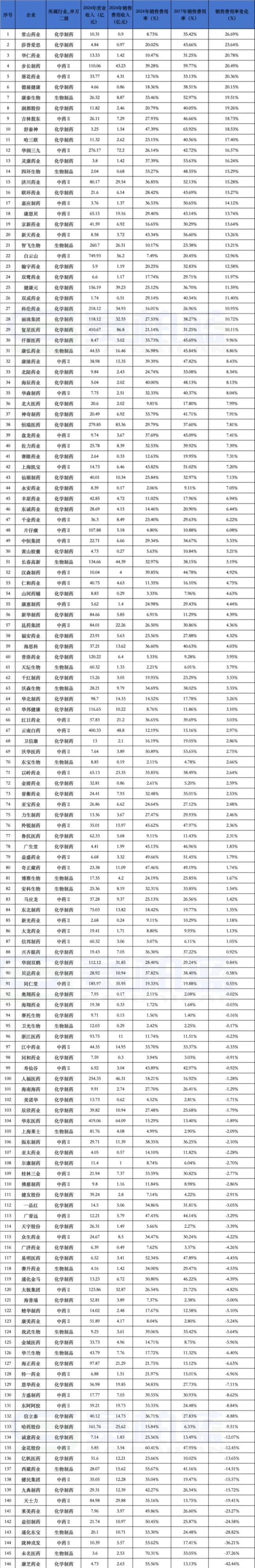 附:146家药企2017年、2024年销售费用率及变化详单
