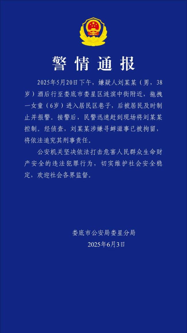2025年5月20日下午,嫌疑人刘某某(男,38岁)酒后行至娄底市娄星区涟滨中街附近,拖拽一名6岁女童进入居民区巷子,被居民及时制止并报警。接警后,民警迅速赶到现场将刘某某控制。经侦查,刘某某涉嫌寻衅滋事已被拘留,并将依法追究其刑事责任。