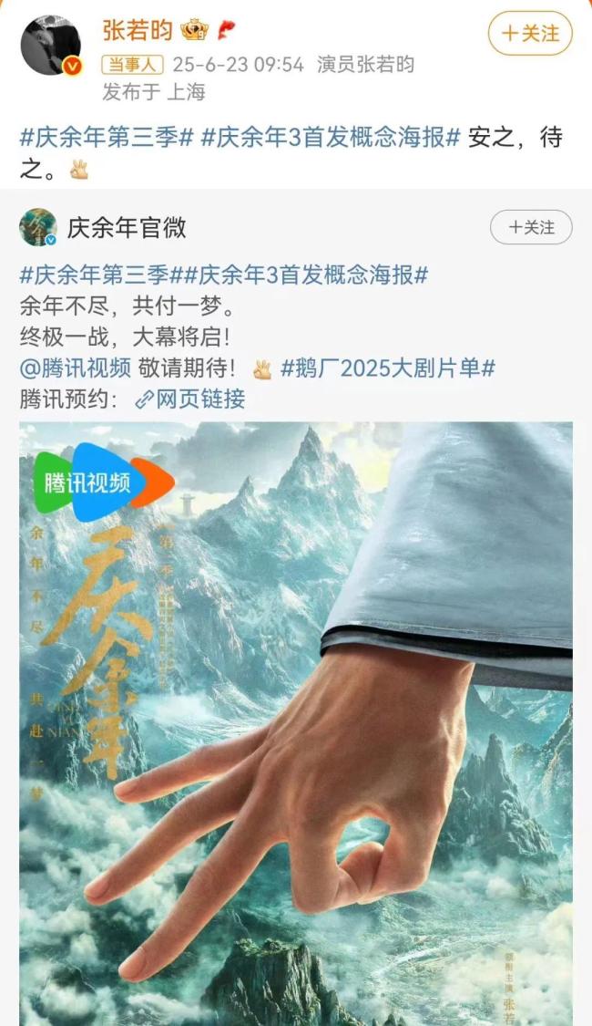 6月23日中午,“张若昀发文回应庆余年3”的词条登上热搜榜首。当天,《庆余年》官方账号发布了《庆余年3》的概念海报,并配文:“余年不尽,共付一梦。终极一战,大幕将启!”随后,男演员张若昀转发了这条微博,并表示“安之,待之”。