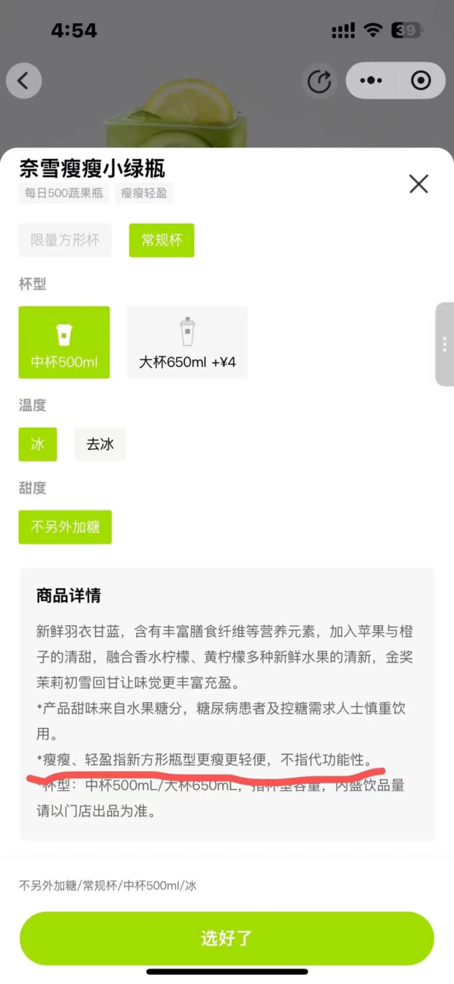 奈雪的茶曾推出一款名为“奈雪瘦瘦小绿瓶”的产品,在产品的相关海报中羽衣甘蓝、橙子、柠檬、苹果等蔬果位置显著,只不过在商品描述中多了一行字:“瘦瘦、轻盈指新方形瓶型更瘦更轻便、不指代功能性”。
