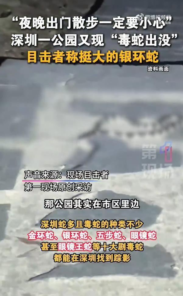 深圳一公园现巨型毒蛇 市民散步需谨慎。近日,广东深圳有网友发布视频称在翠竹公园散步时疑似遇到剧毒银环蛇。10月12日,目击者在接受采访时提到,该公园位于市区内,周围还有许多居民区。他表示,在这种地方发现这么大的毒蛇确实很危险,提醒大家以后出门散步,特别是晚上,要格外小心。