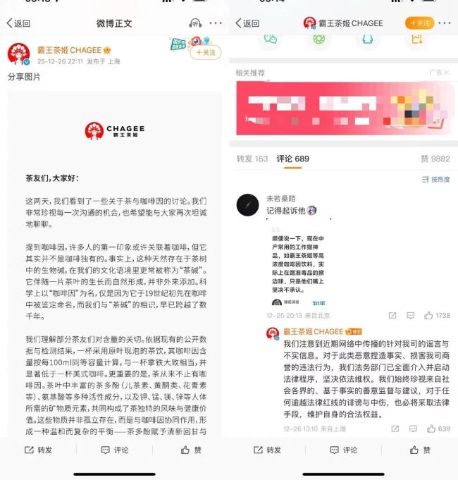 12月26日,霸王茶姬官方微博发文回应“咖啡因”争议。文中表示,依据现有的公开数据与检测结果,一杯采用原叶现泡的茶饮,其咖啡因含量按每100ml同等容量计算,与一杯拿铁大致相当,并显著低于一杯美式咖啡。
